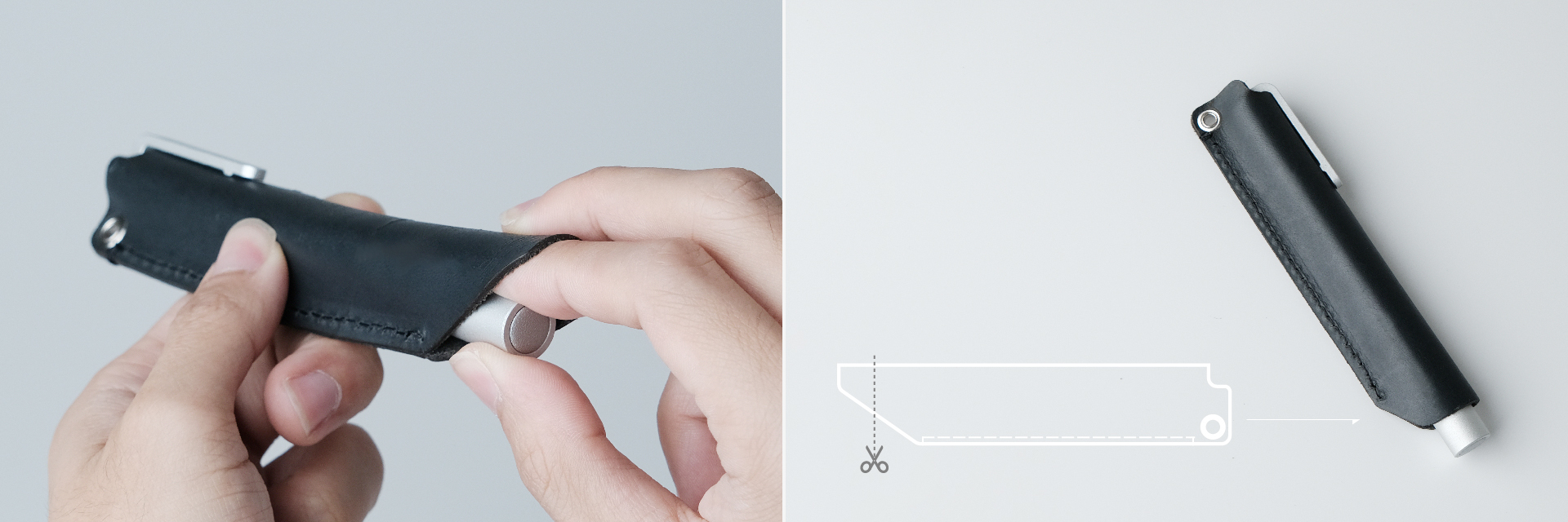 新品皮套較為硬挺,可輕壓皮革使其柔軟;初次使用時若不易放入筆,建議撐開筆夾,將整支筆由上方置入。