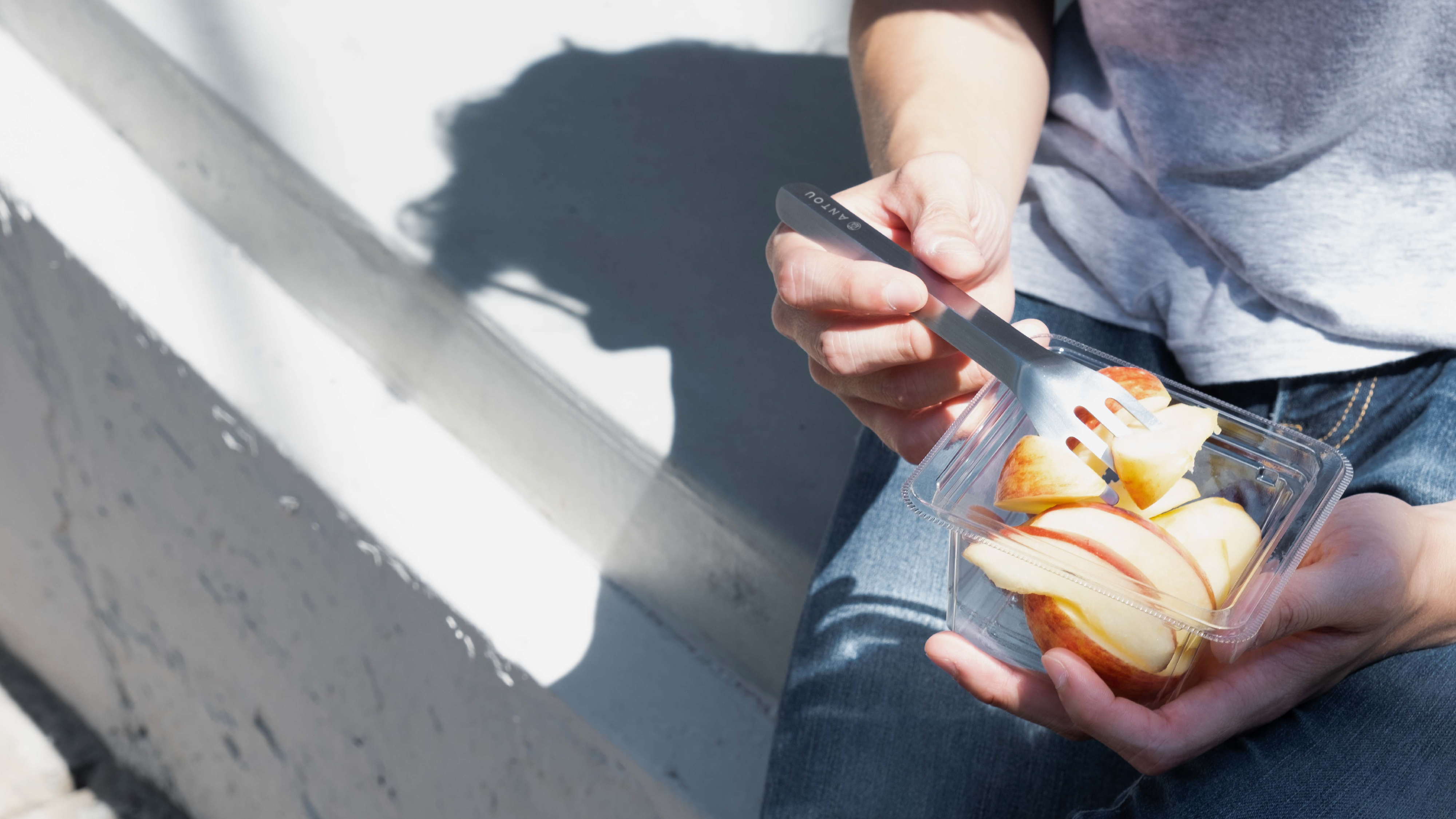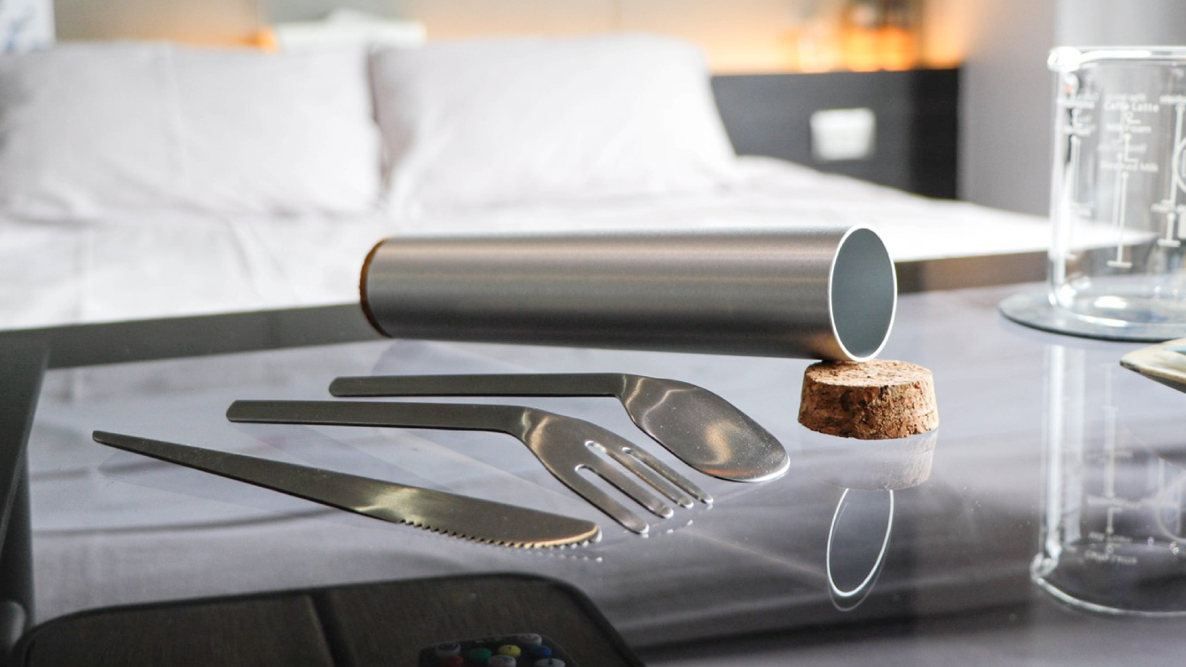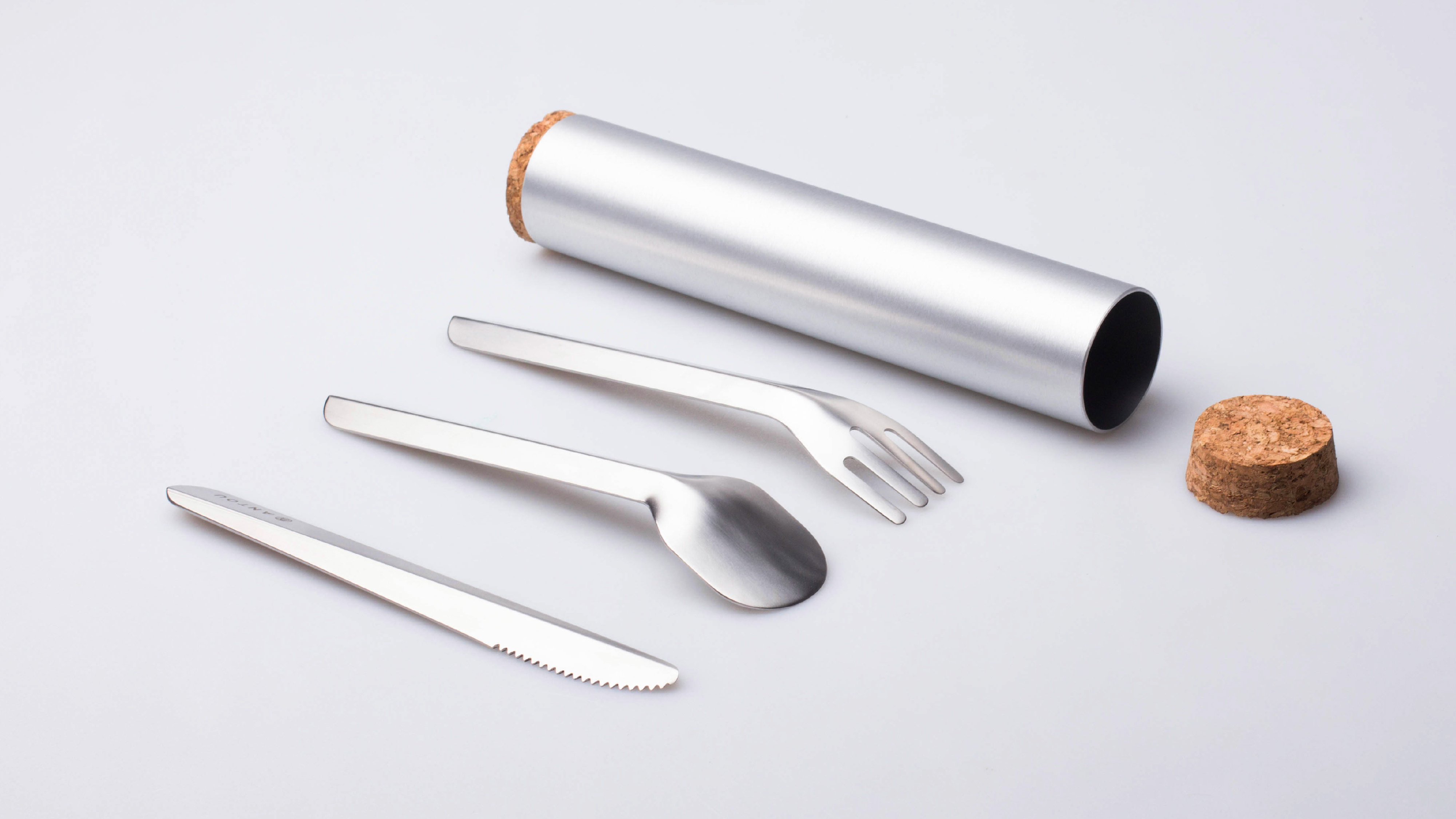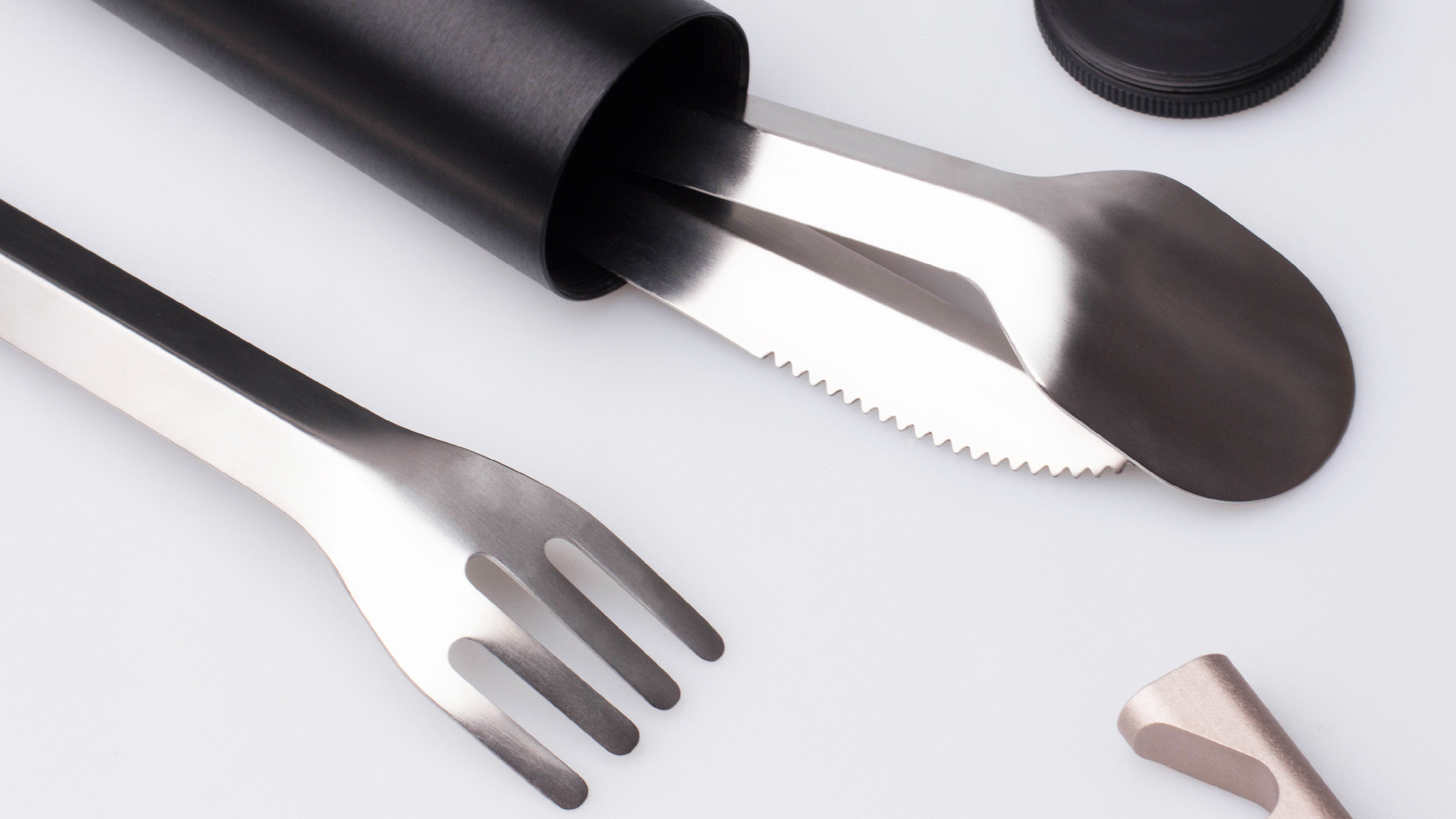 利用稜面折線讓薄薄的板材也能變得堅固。設計運用了這樣的特性來滿足應用需求,使用醫療等級的316L不鏽鋼板壓折成型,再附贈精緻的鋁製收納攜帶罐,成為堅固、可推疊又具個性特色的環保餐具組。