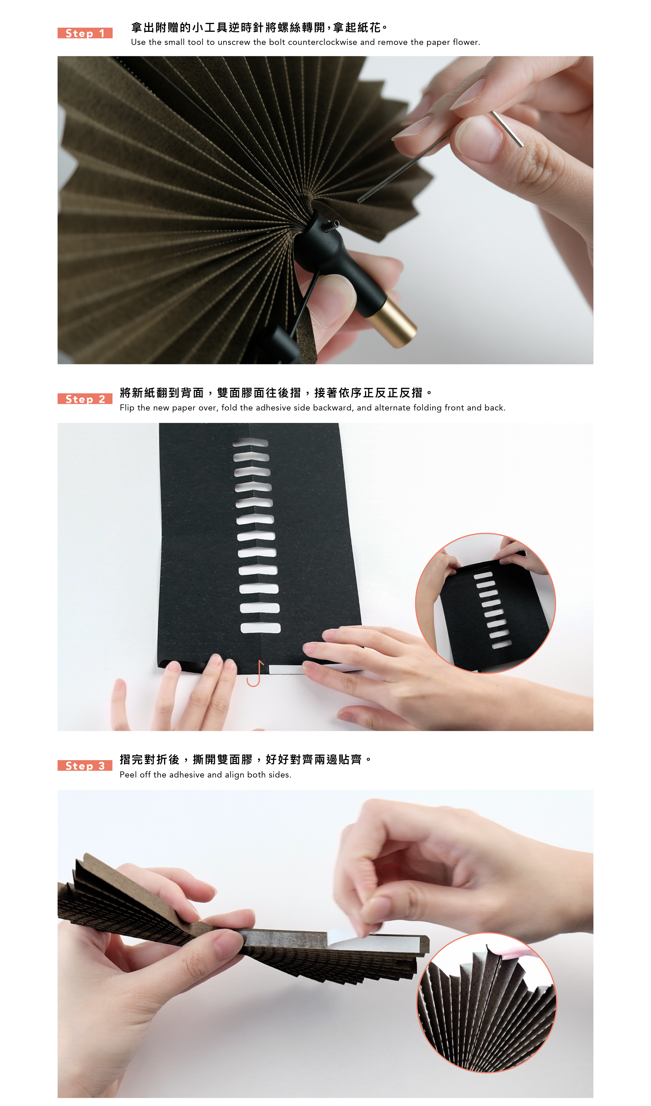 紙花源自摺紙工藝,融合自然、東方文化、俐落卻溫潤的線條,在每個季節選上一朵喜歡的紙花,放置在窗台的一角、書房的桌上、臥室床前,讓四季悄悄的綻放在空間中。