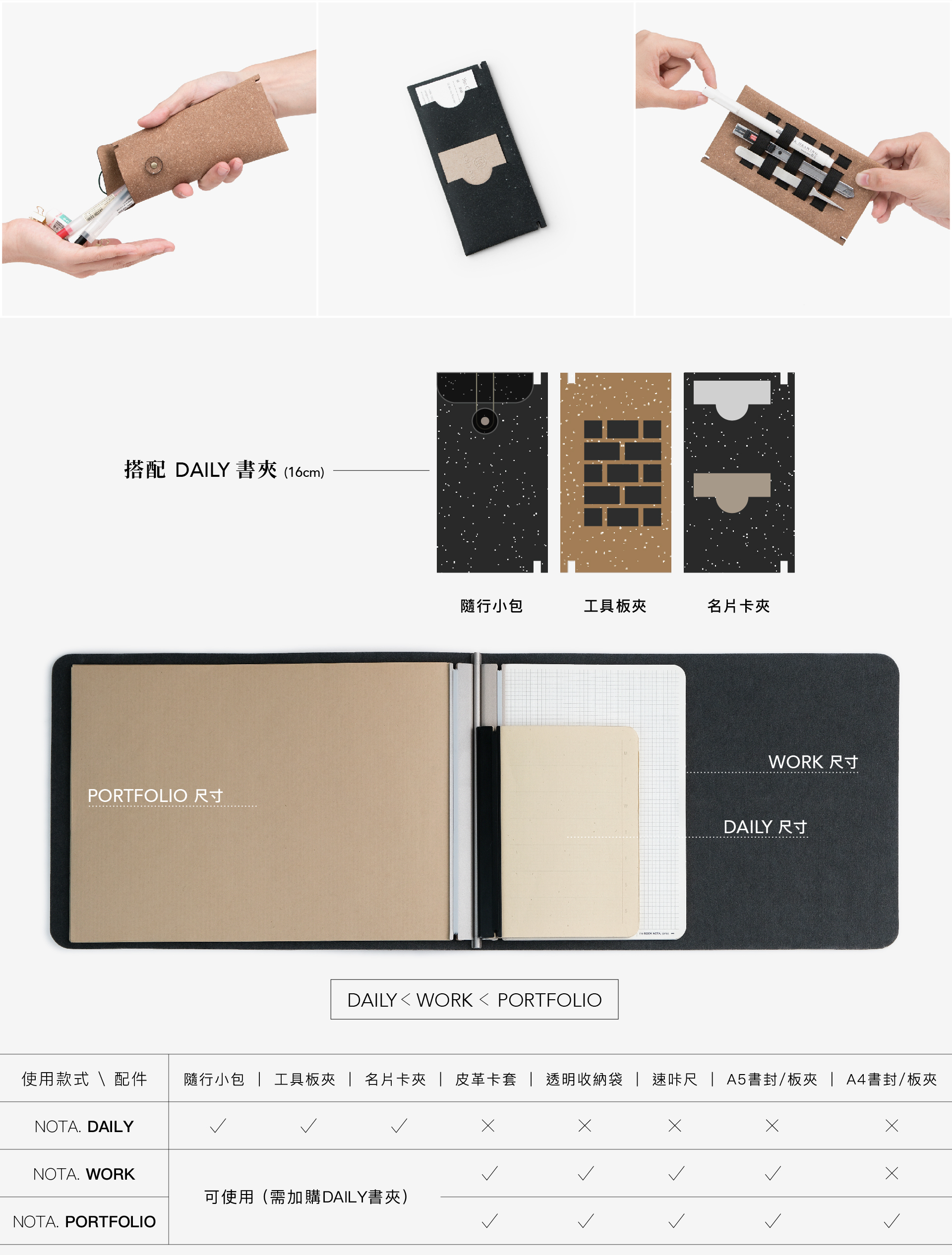 bookNOTA尺寸有三種,由小到大依序為DAILY, WORK, PORTFOLIO