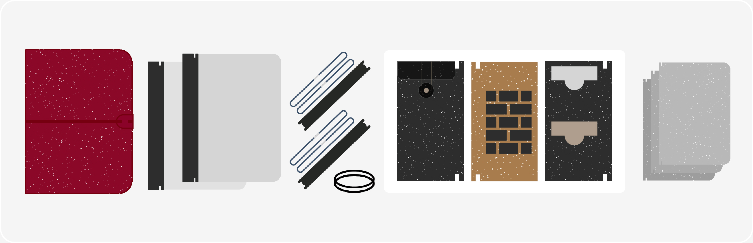 不同大小的筆記本彼此互補,配件之間自由流通,讓工作、生活與創作各自有序又能靈活交錯。模組化設計帶來的,不只是重複使用的效率,更是一場關於整理、書寫與自我風格的無限遊戲——在你的節奏裡,自由切換、盡情發揮。