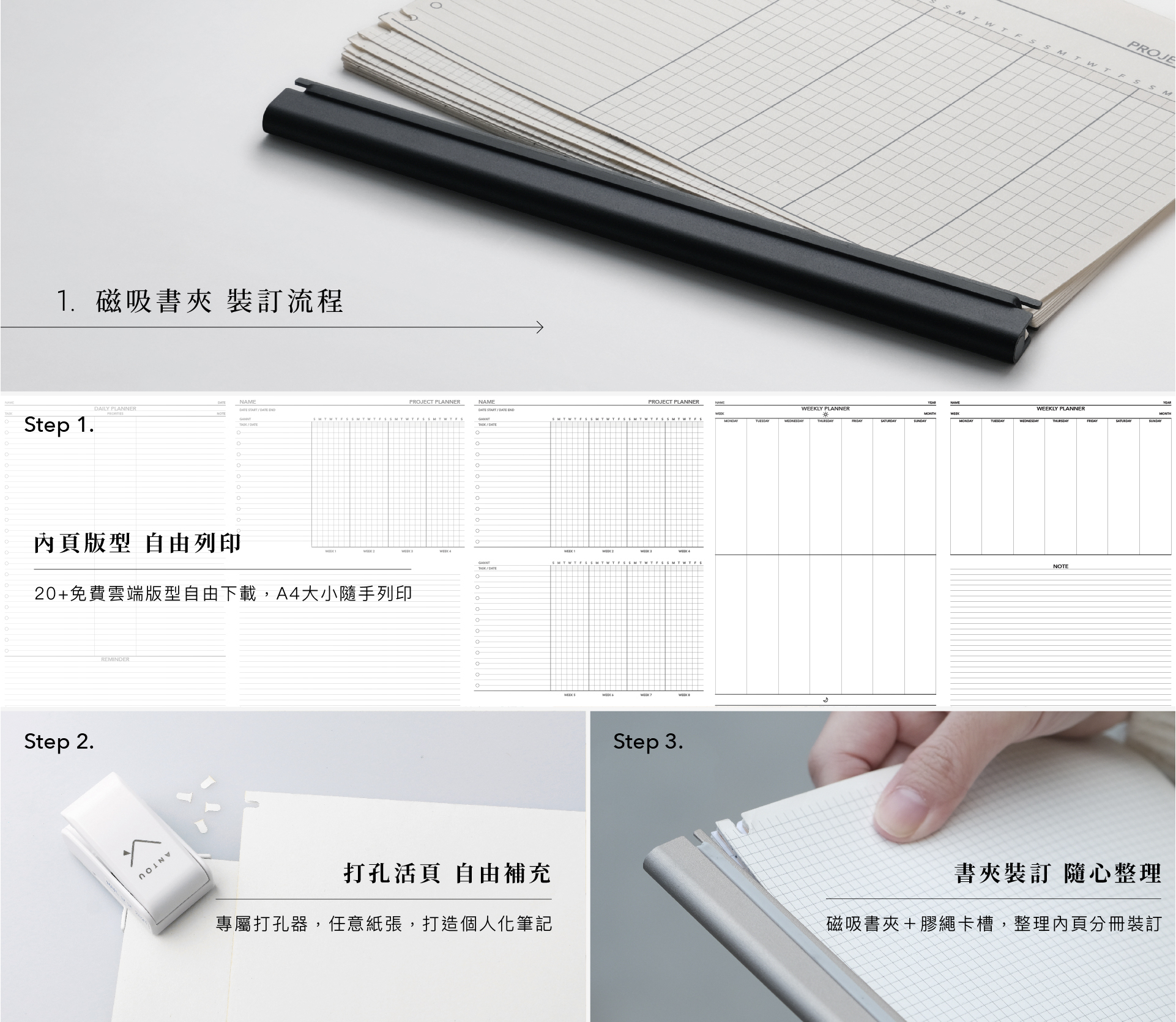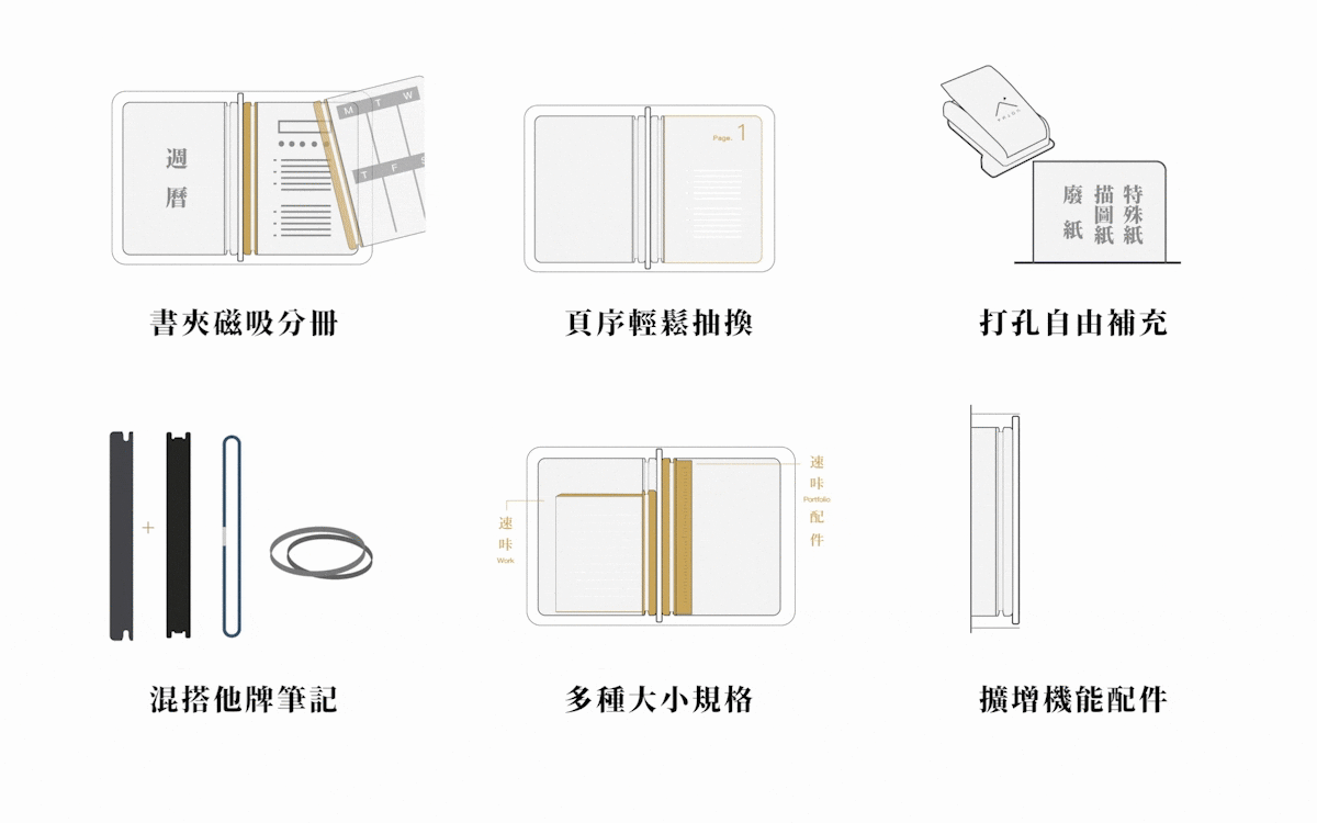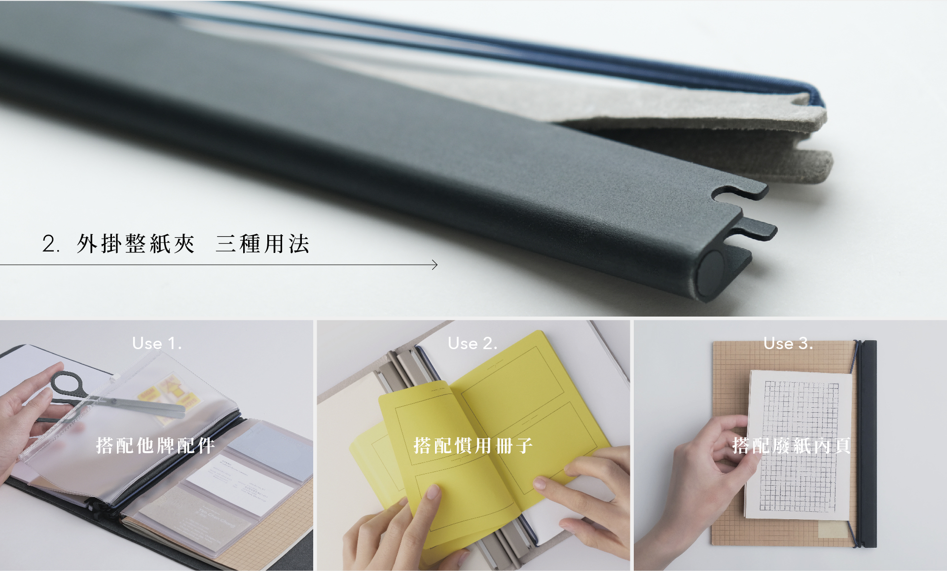 不同大小的筆記本彼此互補,配件之間自由流通,讓工作、生活與創作各自有序又能靈活交錯。模組化設計帶來的,不只是重複使用的效率,更是一場關於整理、書寫與自我風格的無限遊戲——在你的節奏裡,自由切換、盡情發揮。