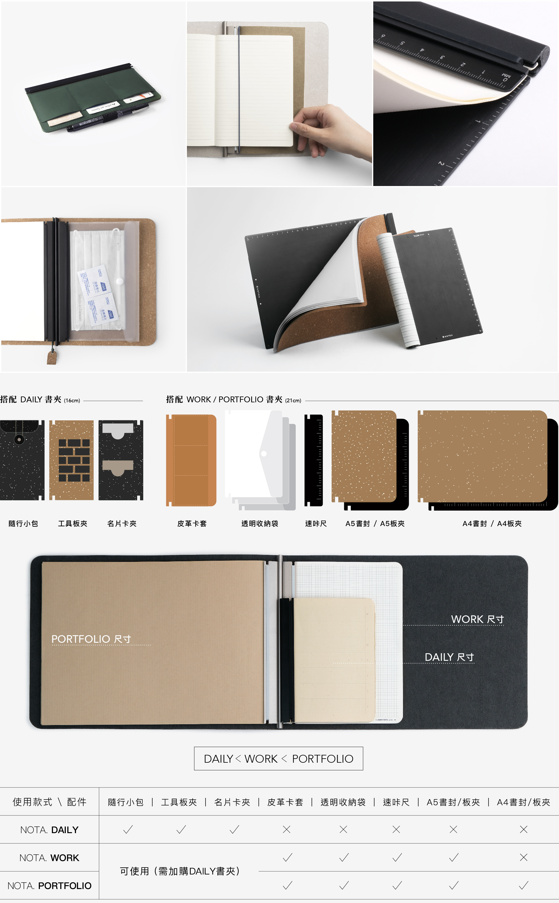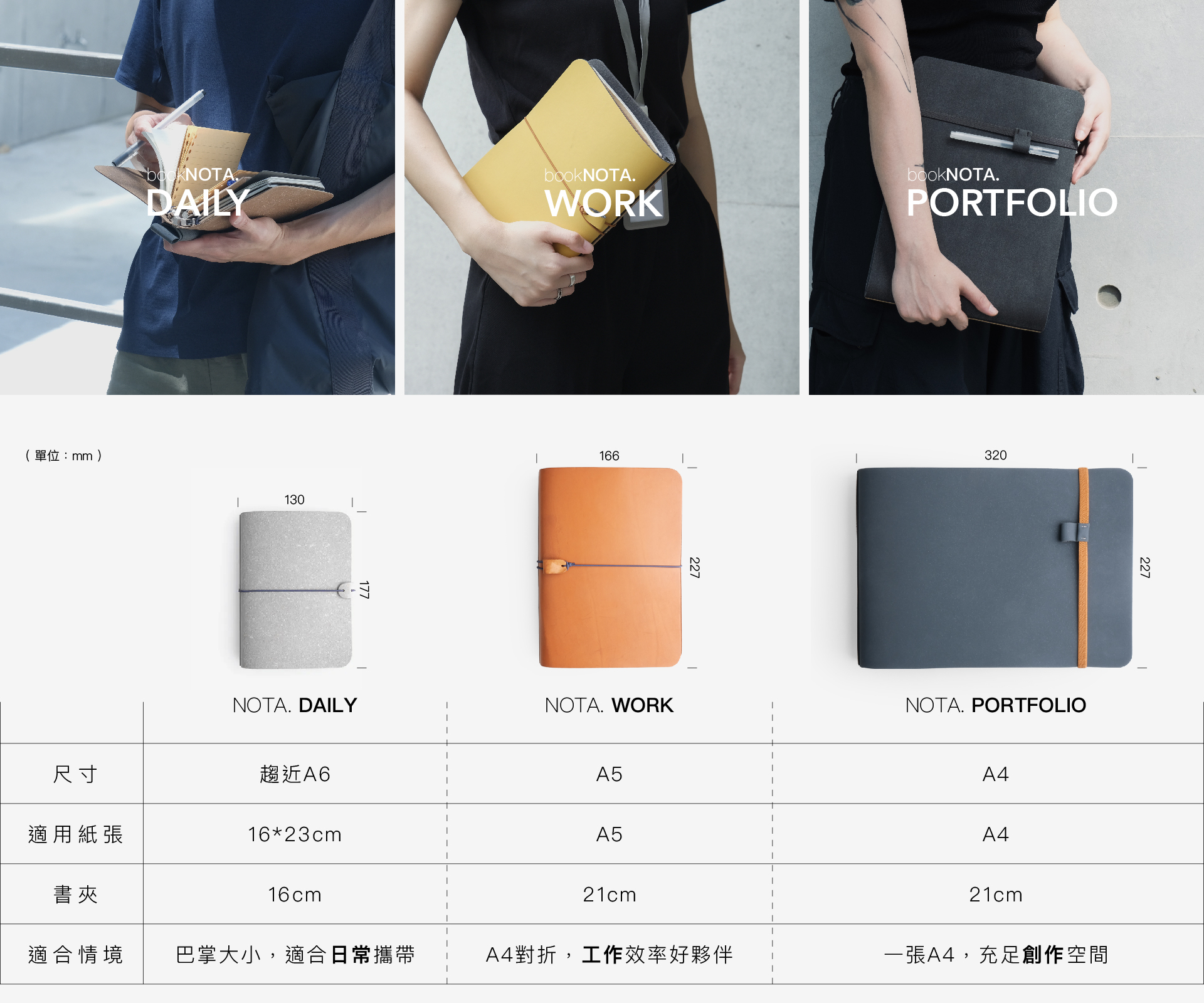 bookNOTA尺寸有三種,由小到大依序為DAILY, WORK, PORTFOLIO