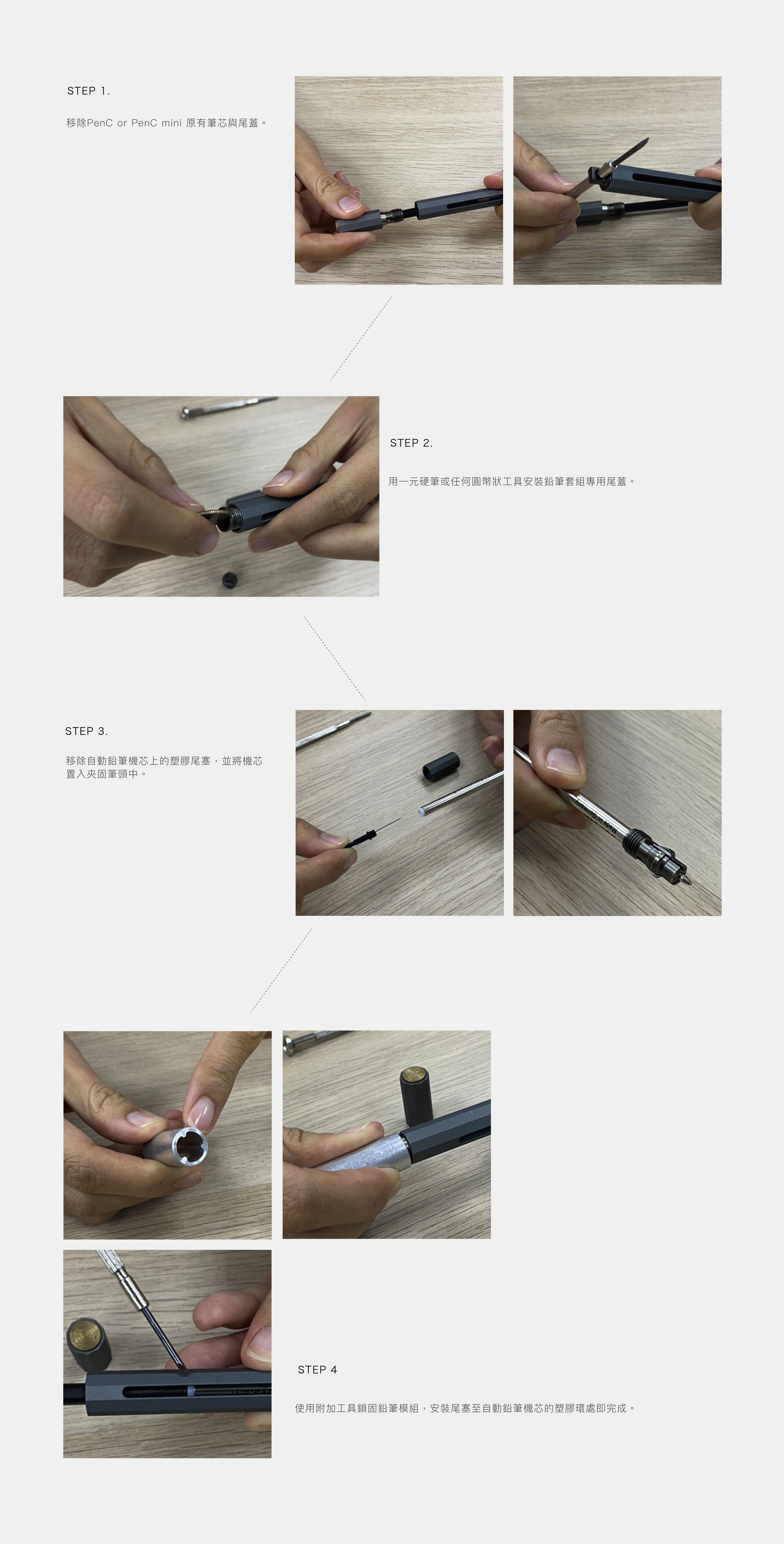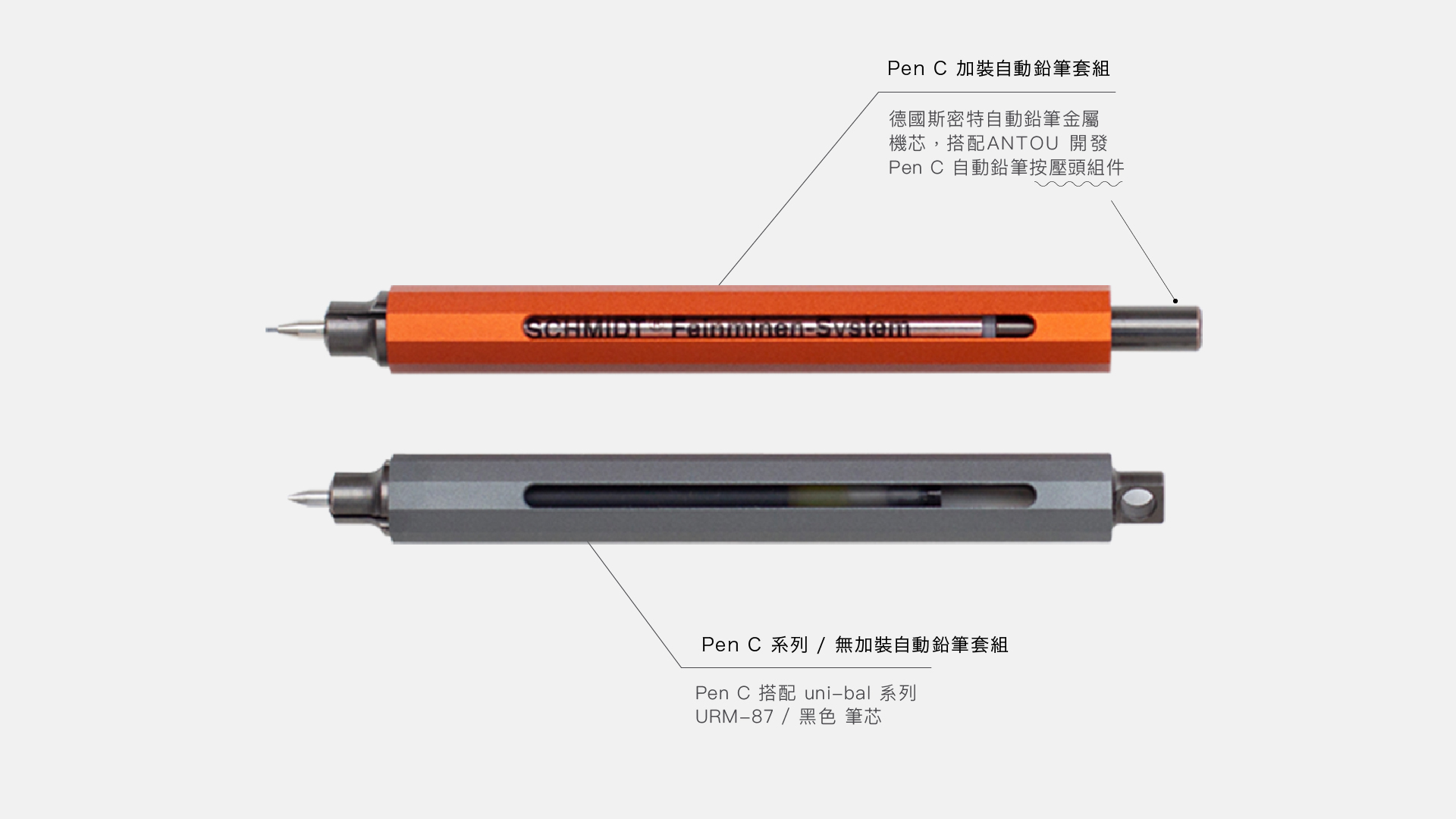 透過全金屬自動鉛筆套件,採用與Pen C 相同的機構組件,方便安裝且可隨心替換,使 Pen C 鋼珠筆成為個性十足的自動鉛筆。