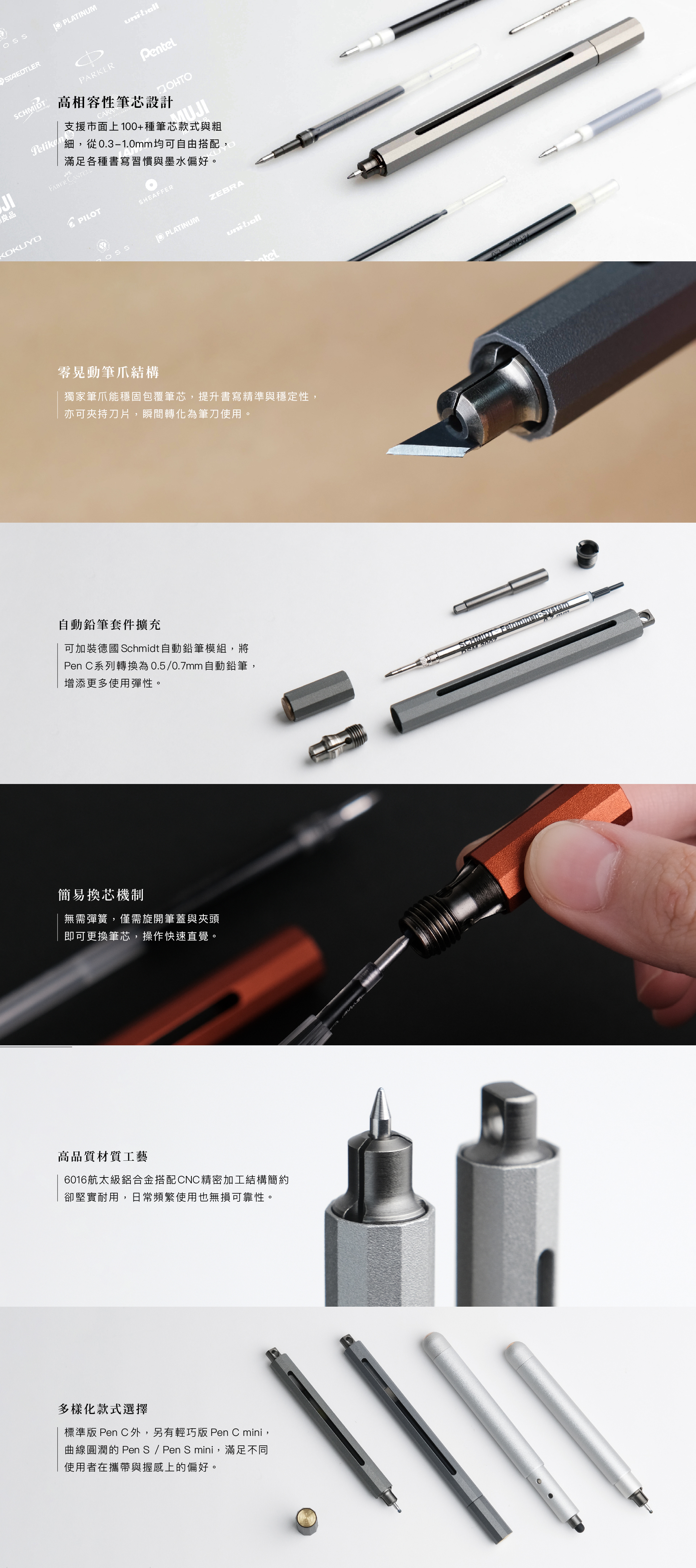 經多次調整與實測,現已支援市面上100+筆芯,皆可依個人習慣與品牌偏好自由選擇。簡潔穩固的筆身設計,讓筆芯成為唯一耗材,實現可長久使用的永續構想。對許多使用者而言書寫不再單調,走進文具店宛如一場筆芯搭配的趣味實驗。