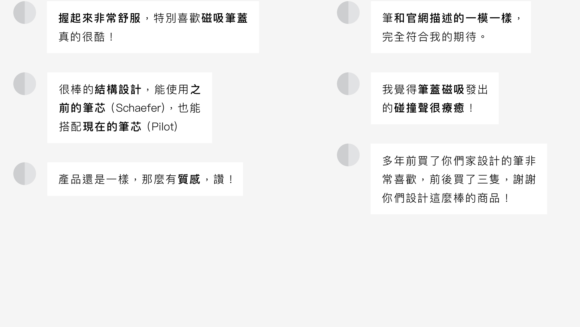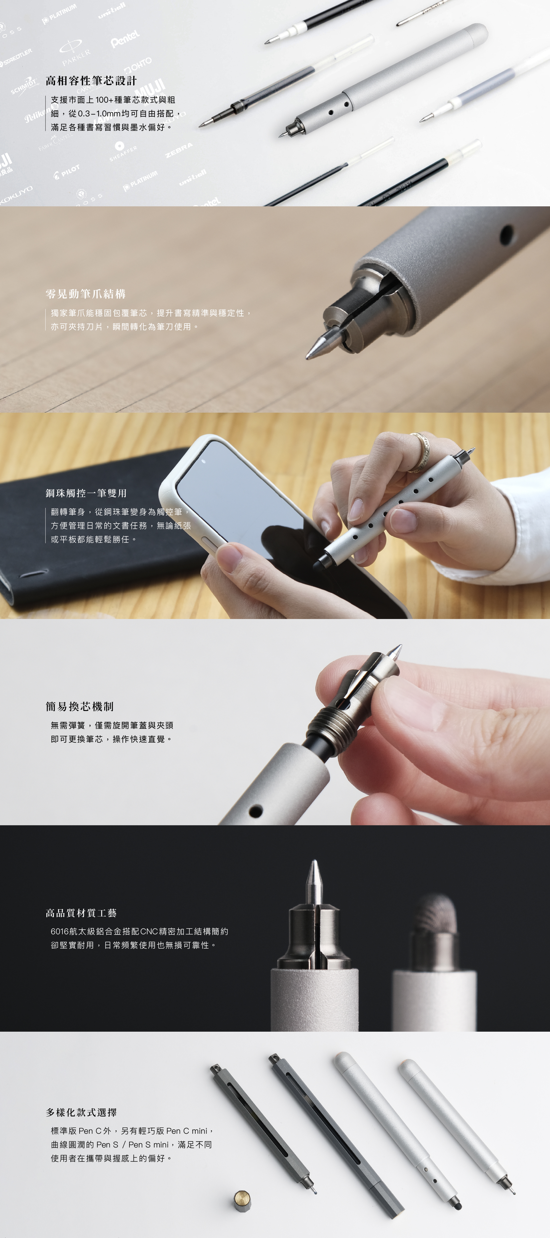 經多次調整與實測,現已支援市面上100+筆芯,皆可依個人習慣與品牌偏好自由選擇。簡潔穩固的筆身設計,讓筆芯成為唯一耗材,實現可長久使用的永續構想。對許多使用者而言書寫不再單調,走進文具店宛如一場筆芯搭配的趣味實驗。
